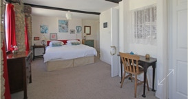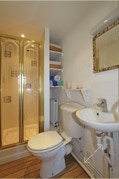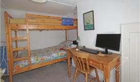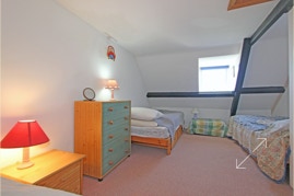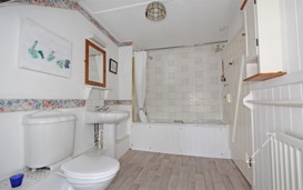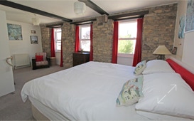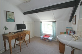 The master bedroom has a king sized bed, room for a truckle bed or cot, and en suite shower. There's also a large family bathroom and a bunkroom with two bunks. There's a double bedroom on the top floor with glimpses of the sea. There is also a room with three single beds, which may be hired in lieu of the double bedroom. (Only one room on the top floor may be used at a time due to fire regulations).