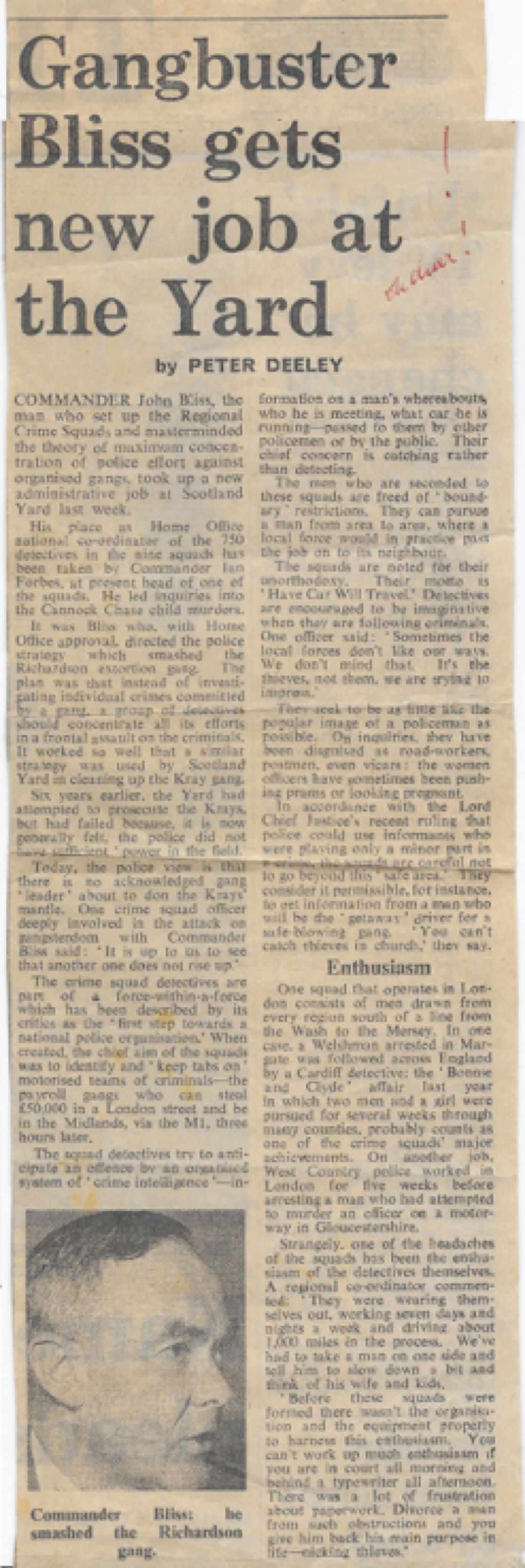 An Observer article on 04 01 1970 says, “Bliss, with Home Office approval, directed the police strategy which smashed the Richardson extortion gang. It worked so well that a similar strategy was used for the Krays."