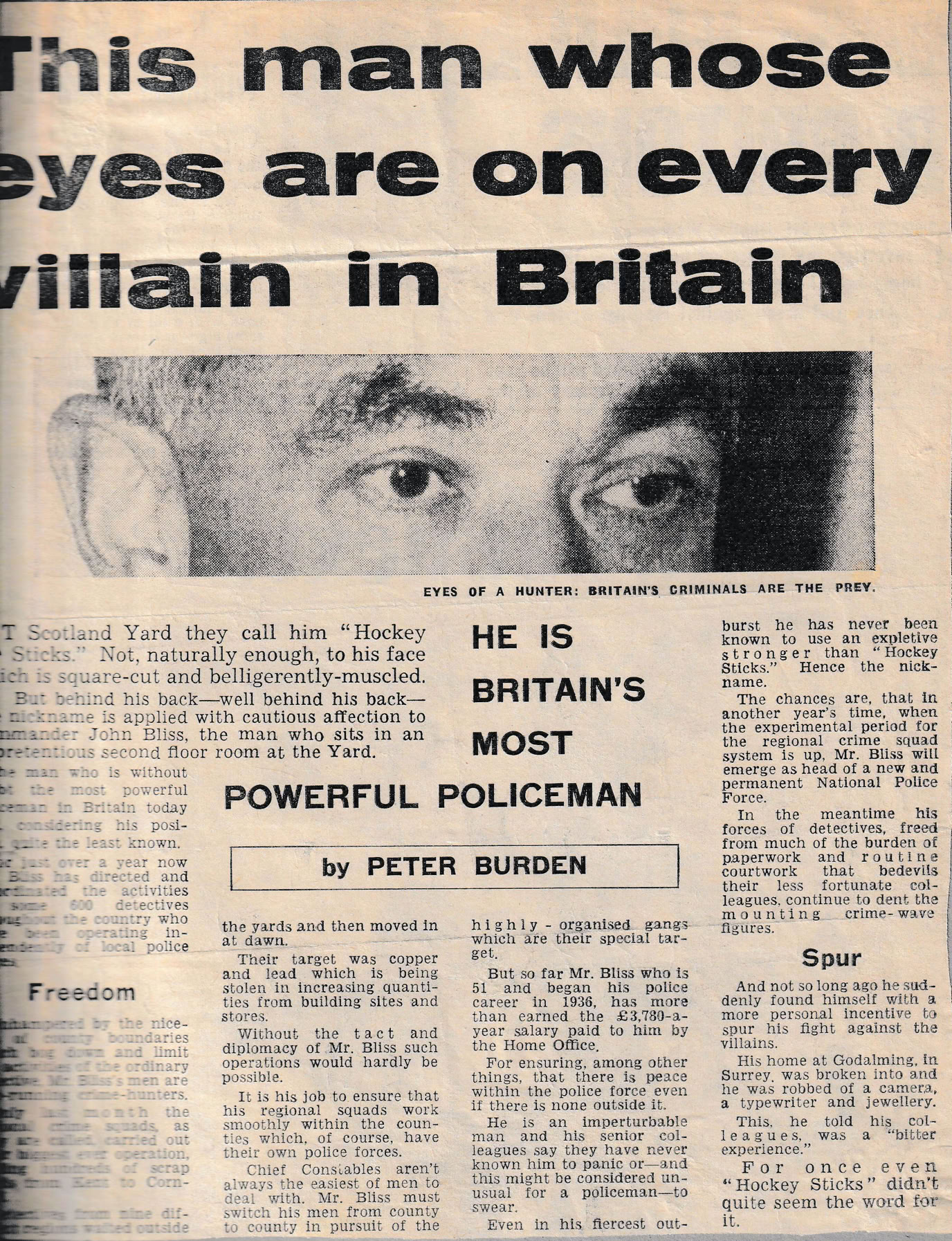 Leonard 'Nipper' Read, who arrested the Krays and became the third NCRCS himself in 1972, wrote in his book (the family has the signed copy he gave to JCB); "John Bliss, my (first) DI from Albany St, was the man who really set up the Crime Squads and got them running, something for which he never received the credit he deserved."