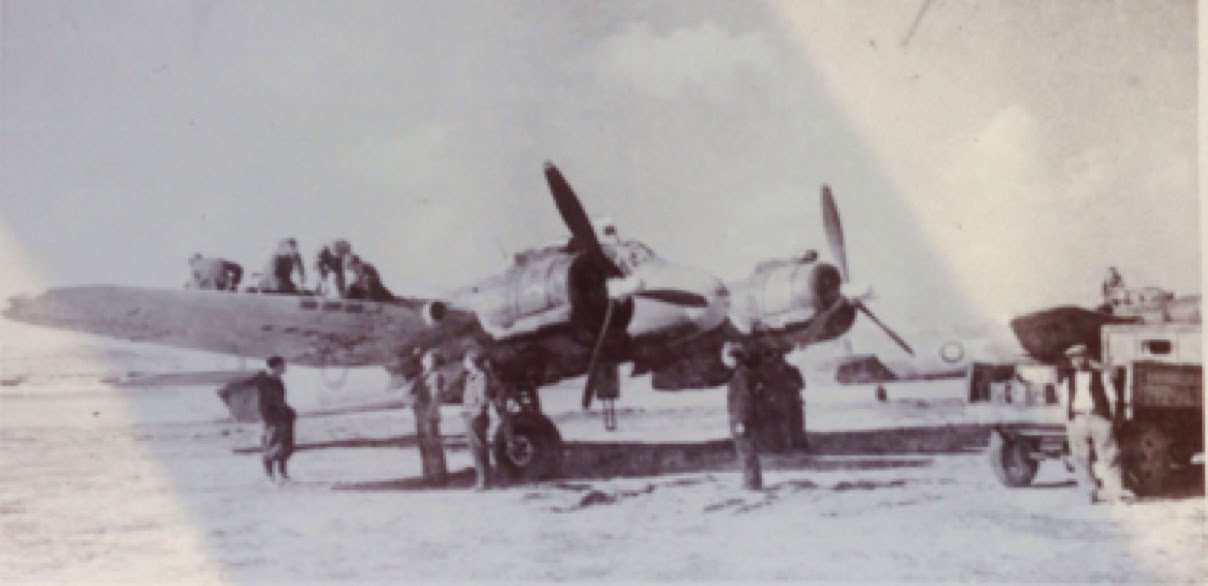 Signed off as 'above average' on 29 06 43, he joined 227 Squadron which had 16 Bristol Beaufighter fighter/bomber aircraft. He'd originally intended to join Fighter Command, but at 28, he said, was considered ‘too old and slow’. As Bomber Command would usually mean very long flights and the carpet bombing of German cities, the Beaufighter was the best compromise available. After ops training with Coastal Command in Cumbria, firing torpedoes at dummy ships in the Solway, he was finally posted to Cyprus with the Marine Expeditionary Force in June 1943.