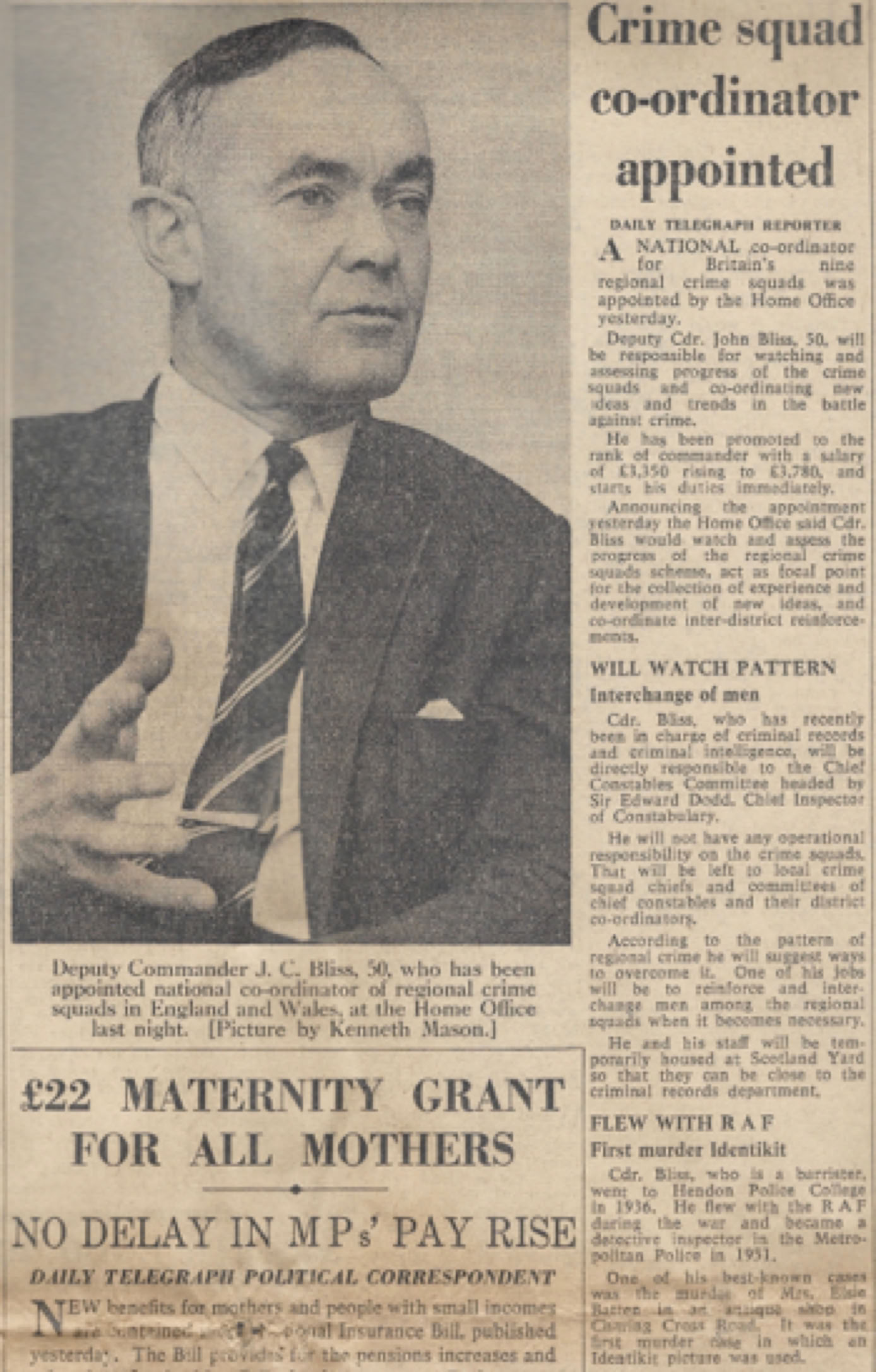 DAC John Cordeux Bliss (Who’s Who / Wiki) QPM, 1914 - 1999, was founder of The Regional Crime Squads, which evolved first into the National Crime Squad and then into the Regional Organised Crime Units of The National Crime Agency. He was also a fighter/bomber pilot during World War II.